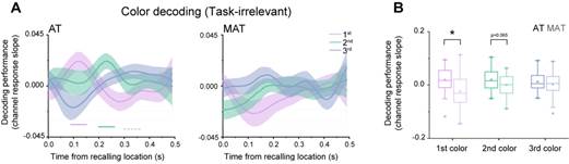 图3:颜色信息在位置信息回想阶段的重激活。(A)左边:AT条件;右边:MAT条件。(B)两条件之间的差异。