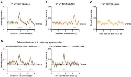 图4:路径结构信息的表征。(ABC) 1st-2nd, 2nd-3rd , 1st-3rd路径表征。(C)1st-2nd路径重激活与行为表现的关系。