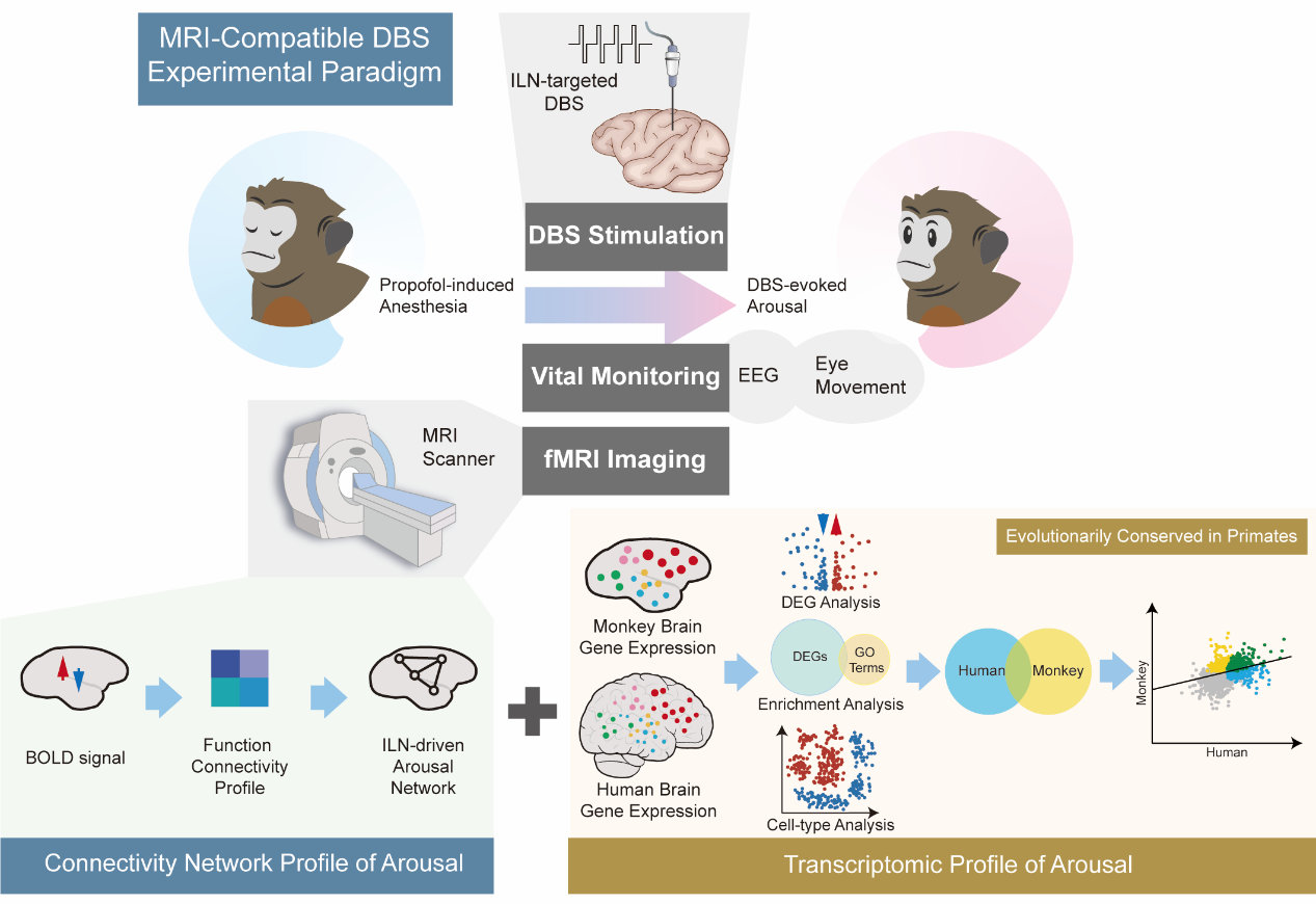 磁共振成像作为支撑平台技术,与电生理、光遗传、基因测序等多种技术快速发展结合(Finn et al., Nature, 2023),为探索大脑功能与行为表型的神经环路及生物学机制开辟了新道路。王征实验室长期聚焦神经影像和神经调控技术在脑科学与脑疾病中的应用,特别专注猕猴磁共振成像(Biol Psychiatry, 2016; Am J Psychiatry, 2021; Cell Discovery, 2021; eLife, 2022),近年来融合转录组学(Nat Commun, 2023; Cell Reports, 2023)、神经调控(Mol Psychiatry, 2022)等多个交叉方向取得了系列研究成果。丘脑与大脑皮层间的长程通讯,尤其是与丘脑板内核ILN相关的通讯被认为与觉醒(arousal)、意识紧密相关,例如Schiff等人通过电刺激ILN成功唤醒一位昏迷6年之久的植物人(Schiff et al., Nature, 2007)。然而,整合神经调控与神经影像技术来鉴定丘脑板内核与大脑皮层各个区域之间的连接网络十分挑战,而且对其背后的分子细胞机制迄今知之甚少。研究团队首先在猕猴模型上搭建了磁共振成像同步的深部脑刺激 (DBS)系统,且同时实现了3T磁场兼容的多导脑电记录标识丙泊酚麻醉深度的技术,在此基础之上研究电刺激ILN是否能唤醒处于不同麻醉深度的猕猴,以及对应的脑功能连接网络模式。随后基于团队前期构建的猕猴全脑转录组图谱(Nat Commun, 2023), 系统分析了ILN驱动觉醒网络的区域特异性、皮层分层特异及细胞特异性的基因表达谱,并结合美国艾伦脑研究所发布的人类大脑转录组图谱(Hawrylycz et al., Nature, 2012),评估觉醒在灵长类物种间的进化保守性,图1展示了整个课题设计逻辑思路和实验流程。