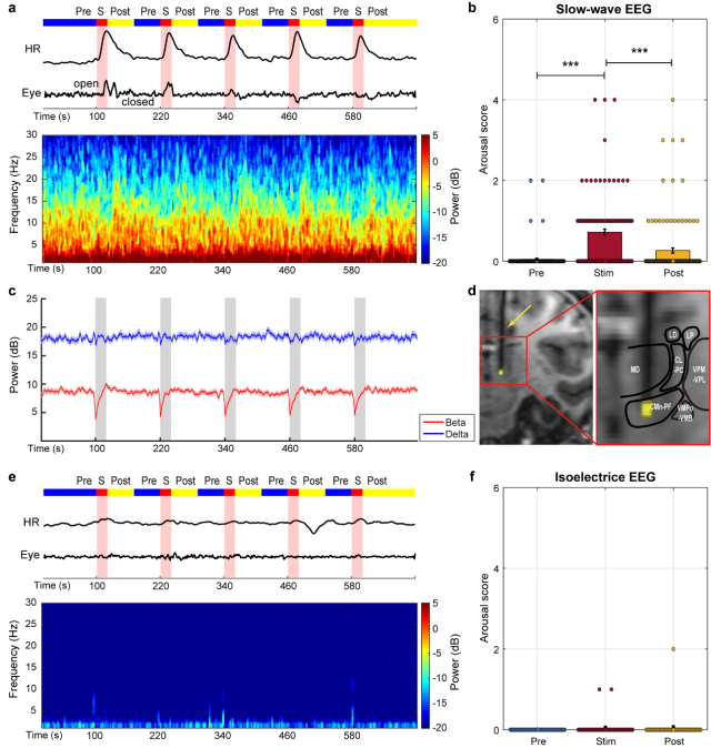 研究团队发现在猕猴丘脑板内核植入微电极后,应用200微安,200赫兹的电流刺激能够将猕猴从处于丙泊酚诱导的慢波振荡(slow-wave oscillations)状态中唤醒(表现为眼睛睁开、嘴巴蠕动以及明显的心跳加快,图2),但实施同样幅值频率的电刺激不能唤醒处于丙泊酚诱导等电位线(isoelectric lines)状态的猕猴。深入分析同步记录的功能磁共振成像信号,发现电刺激ILN诱发了额-顶-颞-枕叶以及壳核等多个区域的功能磁共振信号响应。这些脑区主要参与多模态感觉信息处理、感觉运动信息整合,由此形成了ILN驱动的觉醒网络。