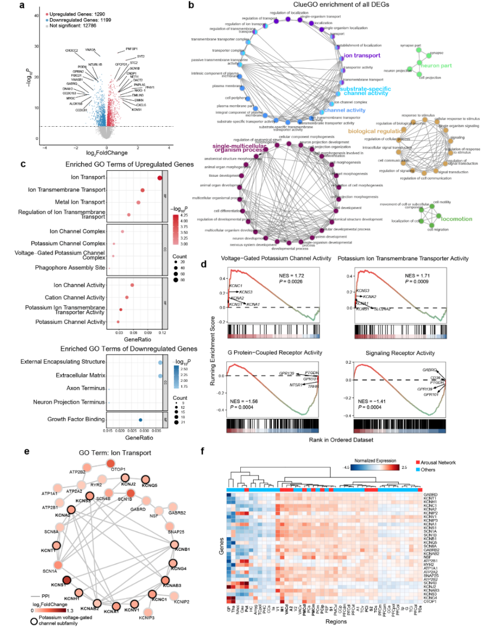 面对ILN刺激选择性激活的、分布在全脑不同区域形成的网络,研究人员非常好奇:为什么唯独是这些脑区产生响应?他们之间的通路有什么特异性的生物学机制吗?于是,研究团队创新性地提出功能网络偏好(network-biased)的转录组学分析,探究这个ILN驱动的觉醒网络与大脑其它地方的基因表达到底有什么不同。根据猕猴全脑转录组图谱中每个RNA采样的空间坐标位置,将覆盖全脑110个脑区的878个样本划分是否属于觉醒网络,并保留了15275个基因开展差异表达分析。结果如图3所示,发现其中2489个基因偏好表达于此觉醒网络(其中1290个基因上调,1199个下调)。针对这些差异基因,ClueGO分析揭示了三个与离子通道相关的集群--"离子转运"、"底物特异性通道活动 "和 "通道活动",凸显了离子通道在觉醒网络中的关键作用。接下来,分别对上调基因和下调基因进行了GO富集分析,发现上调基因高度富集了离子通道相关术语,包括表示生物过程的"离子转运"、"离子跨膜转运";细胞成分的"离子通道复合物"、 "钾通道复合物"、"电压门钾通道复合物";分子功能的"离子通道活性"、"阳离子通道活性"、"钾离子跨膜转运体活性"、"钾通道活性"等。蛋白-蛋白相互作用分析进一步确认了这些差异基因主要集中在电压门控钾离子通道上。此外,研究团队利用猴脑单细胞和皮层分层RNA测序数据,检验这些差异表达基因是否特异性地富集在某些细胞类型或者特定的皮层位置,结果发现显著富集在兴奋性神经元、表达小清蛋白的抑制性神经元和少突胶质细胞中。