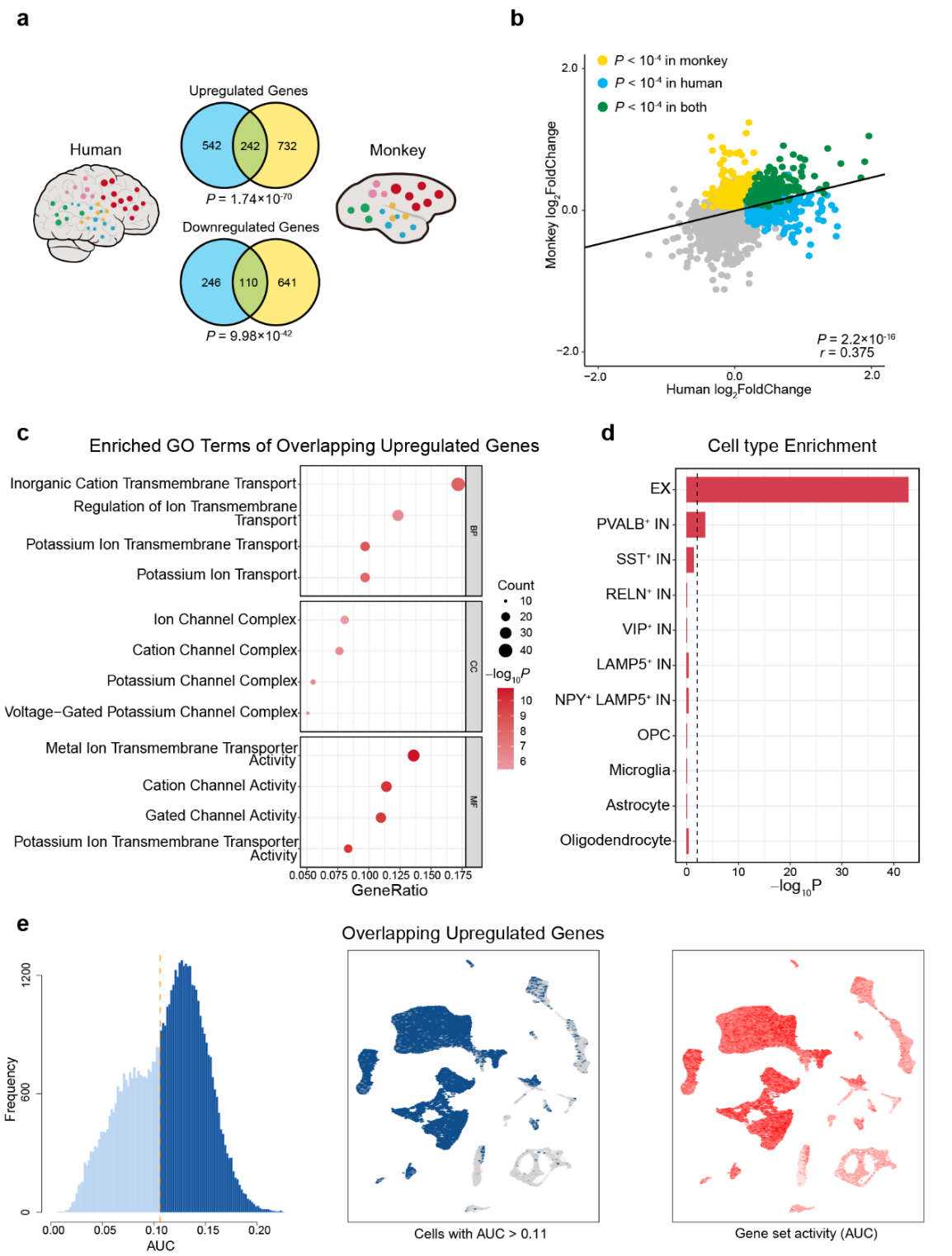觉醒被认为是哺乳类物种间高度进化保守的功能之一。因此,研究团队将在猕猴上鉴别的觉醒网络映射到人类大脑上,同时结合Allen人脑转录组图谱数据进行跨物种比较。结果(图4)发现在猕猴和人类大脑觉醒网络中同时存在242个上调同源基因(占比30.87%)和110个下调同源基因(占比30.90%),且表达水平(log2FoldChange)显著相关(p<2.2×10-16)。这些同源基因在人脑中也是高度富集在钾离子通道,兴奋性神经元、表达小清蛋白的抑制性中间神经元上。这些结果显示了觉醒网络在灵长类间高度进化保守的分子和细胞架构,更是创新性地发展了高通量方法筛选基因、分子、细胞组成等信息解析觉醒网络特征。