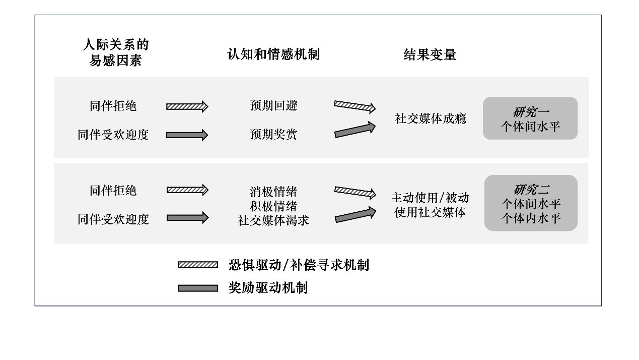 为了进一步探讨社交媒体成瘾的情感中介,并验证恐惧驱动和奖励驱动过程在个体间水平和个体内水平的一致性,研究二采用了生态瞬时评估方法(Ecological momentary assessment),选取了54名老员工作为样本,在为期两周的时间内,使用智能手机应用程序进行数据收集。被试每天五次会在随机的时间点收到提示,填写最近一段时间与同伴相处时感受到的拒绝、接纳、受欢迎,并且报告当下的情感状态、对社交媒体使用的渴望,和具体的社交媒体使用行为。这种方法允许研究人员分析同伴关系、情感状态和社交媒体使用行为在不同时间点的即时关系,同时考察个体内部和个体之间的变异性,并且采集到的数据更具有生态效度。研究二的发现表明,青少年遭遇同伴拒绝后报告的负面情绪显著增加,为了应对这些负面情绪,他们会更多的主动使用(例如发动态、点赞、评论)或被动使用社交媒体(例如:单纯浏览动态)作为一种情感补偿机制。另一方面,青少年受到同伴欢迎时会报告更多的积极情绪,这种积极情绪也让他们更渴望使用社交媒体(例如:发自拍),以进一步获取社会奖励和维持快乐和满足感。奖励驱动通路在个体内水平尤为明显。