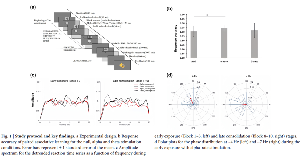 本研究发现大脑可以通过振荡同步自动捕捉外部节律的时间结构,从而促进感知表征和多感觉概念的形成和存储。具体而言,在学习新的形音配对之前,α频率(而非θ频率)的感觉刺激能够重置θ波的相位并增强视听跨通道联结学习能力。