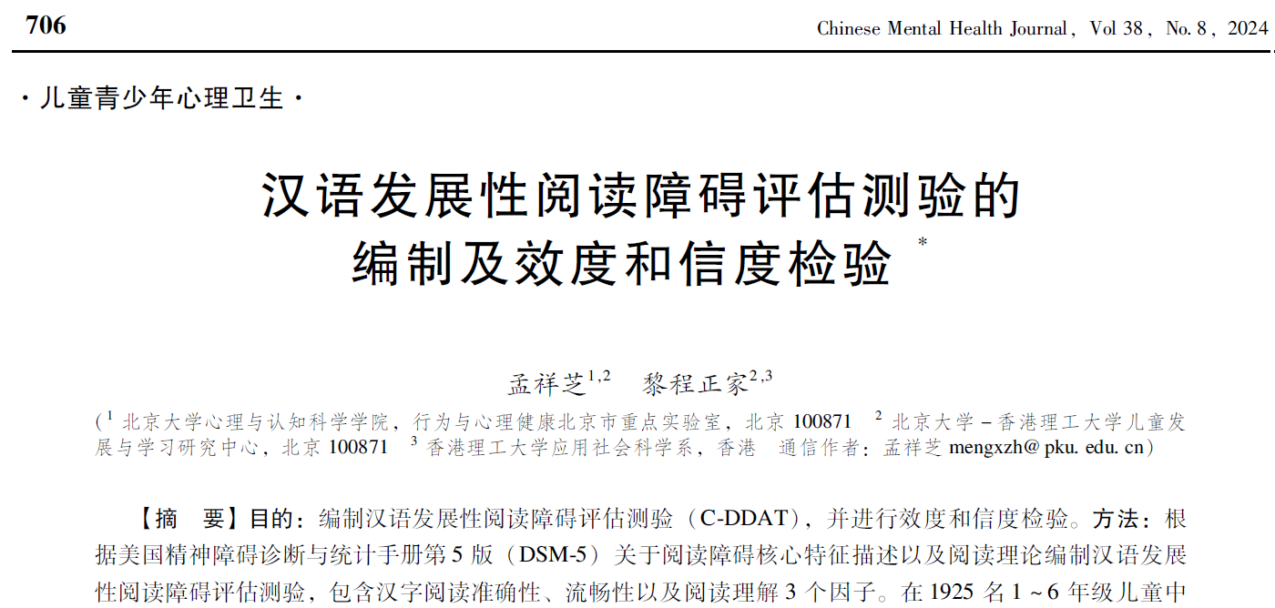 2024年8月孟祥芝课题组在中国心理卫生杂志上发表题为“汉语发展性阅读障碍评估测验的编制及效度和信度检验”的论文。