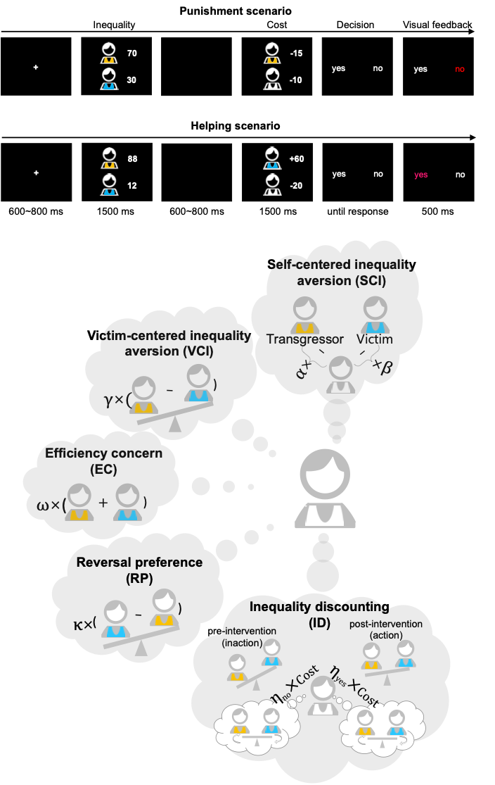 在他们的"干预或旁观"实验中,被试作为局外的"第三方",观察到两名角色(施害者和受害者)之间存在不公平的金钱分配。被试需要在每一回合做出选择:是否愿意付出代价惩罚施害者或者资助受害者,从而干预两人之间的不平等。研究者系统地操纵了4个关键变量(不平等程度、干预成本、干预效率和情境),形成100种不同的实验条件,以多维度、细粒度地考察被试的行为模式。