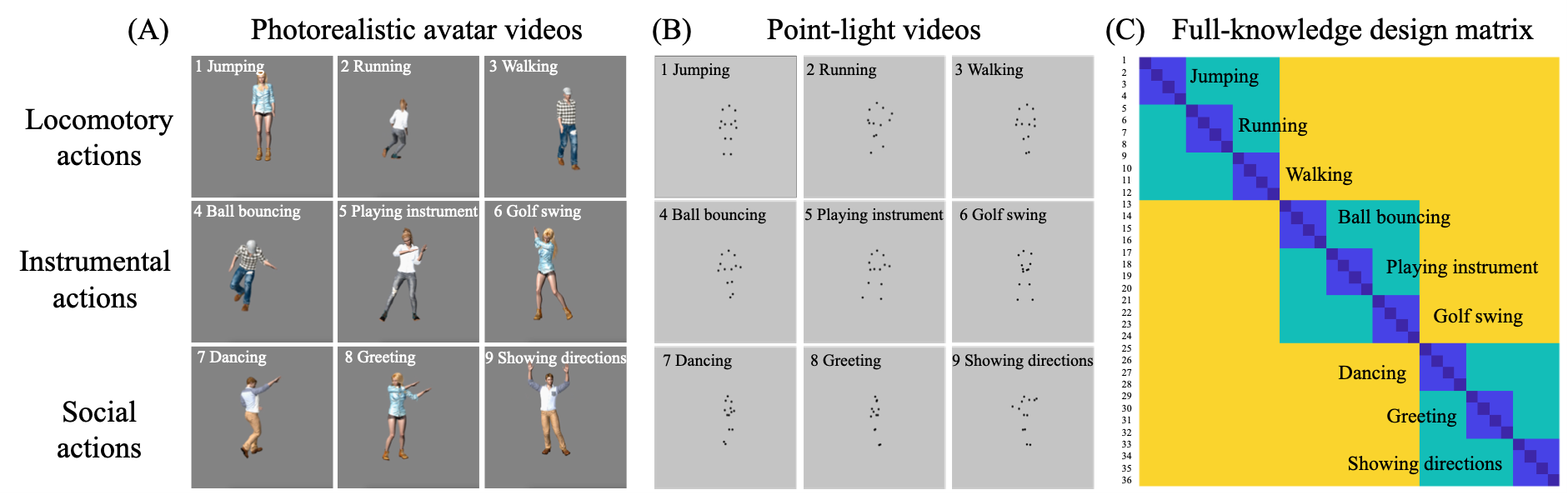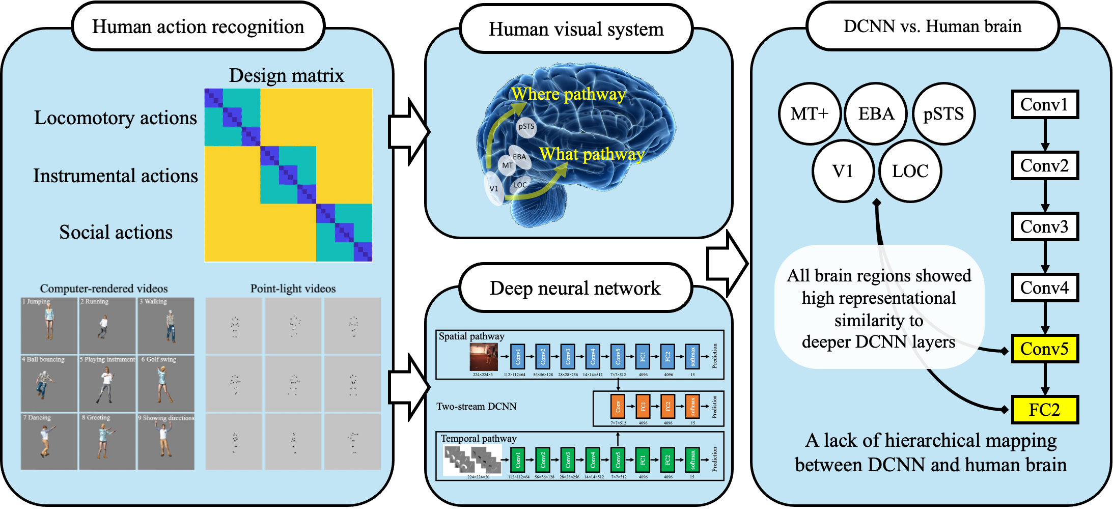 本研究聚焦于动态视觉信息的加工,分别使用逼真的人物模型和精简的电光源人生成的动作视频作为研究材料,系统探索了 DCNN和人类视觉系统在动态视觉信息加工过程中的异同。研究团队通过功能性核磁共振成像技术,采集了人类被试在观看动作视频时的大脑活动,结合多变量解码分析和表征相似性分析,与DCNN进行比较。