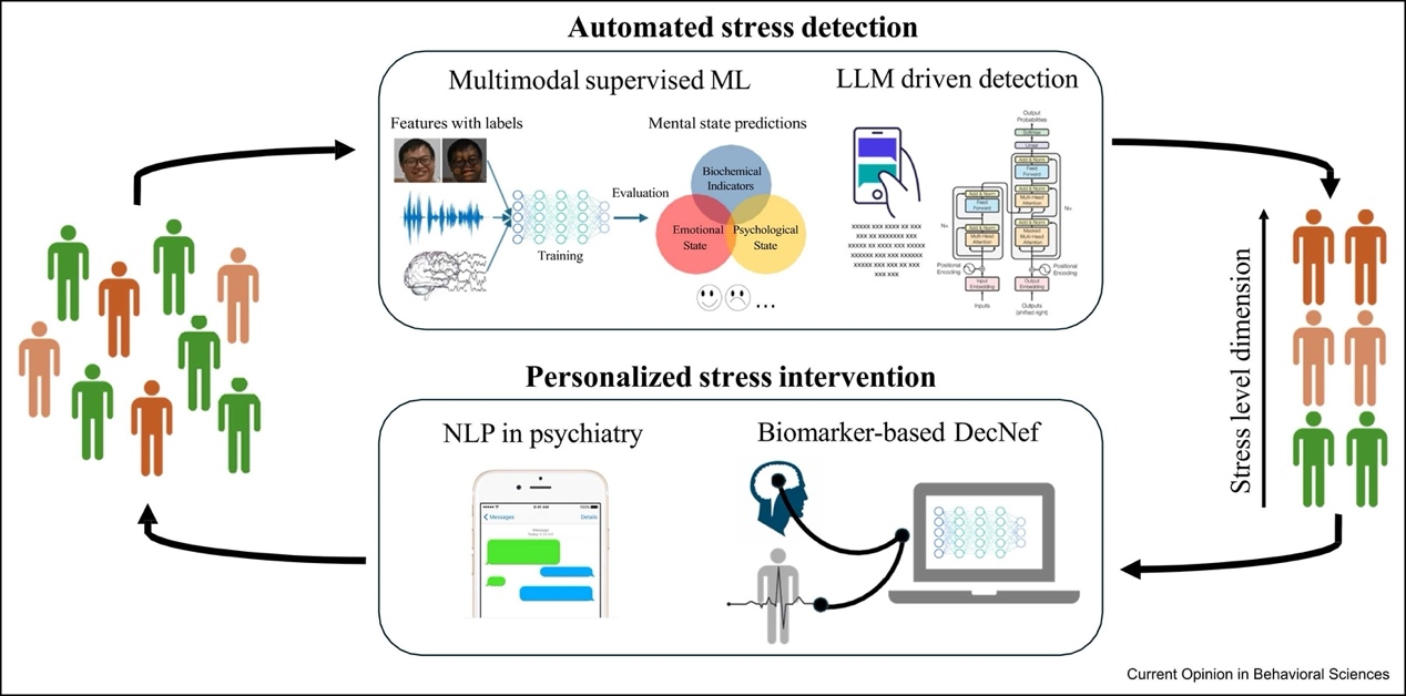 图1. 人工智能在自动化压力检测和个性化压力干预中的应用。(顶部)通过从面部表情、对话和神经信号中提取的多模态特征,监督机器学习(ML)提取生化指标、情绪状态和心理状态的特征,进而预测个体的心理状态。大语言模型(LLM)通过日常基于文本的对话促进压力检测。(底部)此外,基于个体特征,人工智能通过支持自然语言处理的心理治疗和针对神经调控的解码神经反馈(DecNef)促进个性化的压力干预。