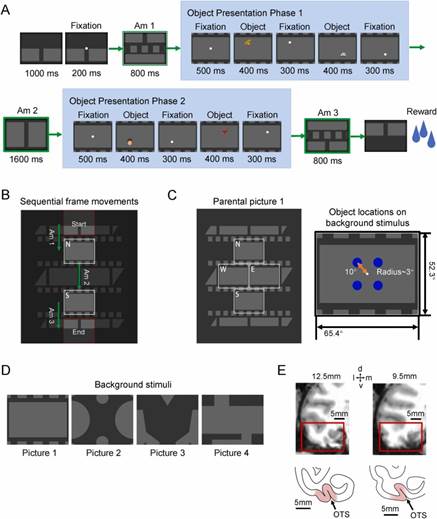 图1. 范式设计和非人灵长类后下颞区示意