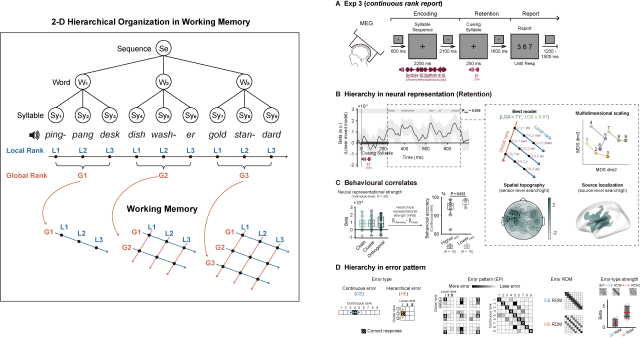 课题组设计了具有自然层级特性的字词序列,让人类受试保持在工作记忆中,通过脑电图、脑磁图记录人脑活动,探究该序列在工作记忆中的神经几何表征模式。研究发现,该一维序列并不是以一维链条或一维组块的形式在工作记忆中存储,而是被重组织到一个二维几何空间上。该平面包含两个近乎正交的表征轴,分别对应整体位置(序列中的组块序号)和局部位置(组块中的元素序号)。简而言之,一维序列依照层级化组织被“折叠”存储在二维表征空间中。这种二维几何模式不仅在多种实验材料和多种实验任务的脑活动中一致出现,也反映在人类的行为,即记忆的错误模式分布上。进一步,神经活动中的层级模式强度和人类行为中的层级特性相互关联。