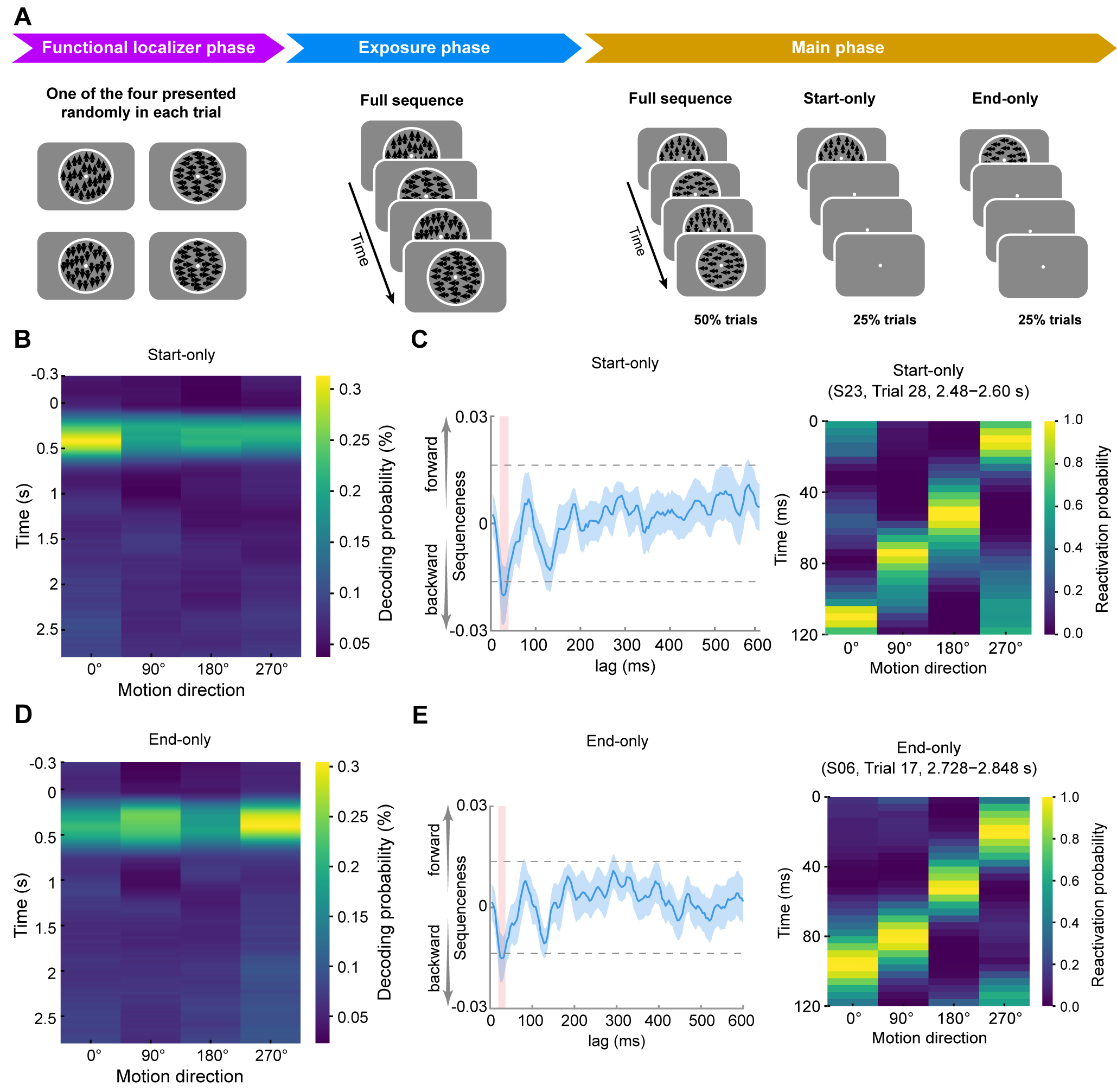 图1 (A)实验1的范式和流程图。被试首先反复观看由4个运动方向组成的固定视觉序列(Exposure phase)。在随后的主任务(Main phase)中,部分试次中仅呈现序列的第一个或最后一个运动方向(作为线索),另一些试次则呈现完整的视觉序列。被试只需对完整序列进行一致性判断。(B)仅呈现序列的第一个运动方向作为线索时,空屏期无法解码出特定的运动方向。(C)仅呈现序列的第一个运动方向作为线索时,左:运动方向形成的序列被以时间压缩的方式进行神经活动反向回放;右:一个代表性被试的神经活动反向回放示例图。(D)仅呈现序列的最后一个运动方向作为线索时,同B。(E)仅呈现序列的最后一个运动方向作为线索时,同D。