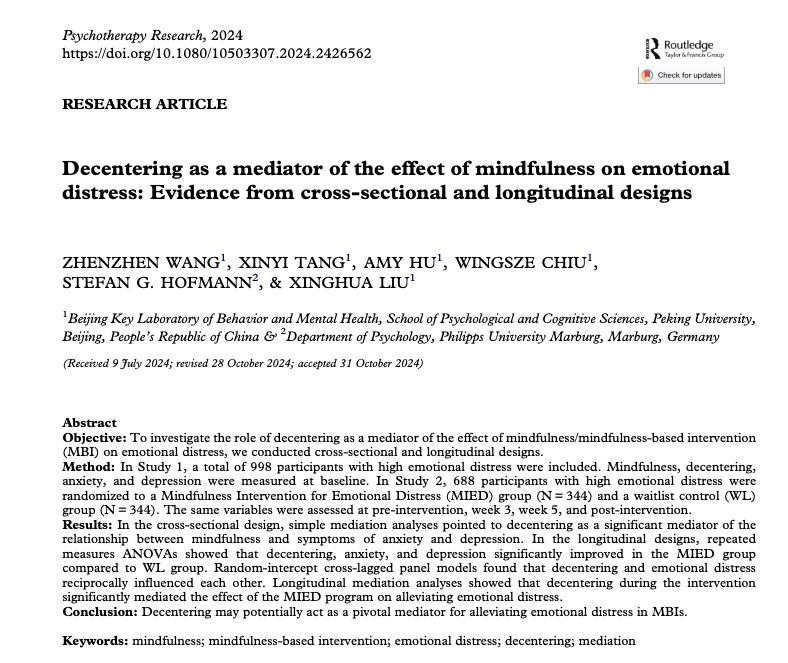 Wang, Z., Tang, X., Hu, A., Chiu, W., Hofmann, S. G., & Liu, X. (2024). Decentering as a mediator of the effect of mindfulness on emotional distress: Evidence from cross-sectional and longitudinal designs. Psychotherapy Research, 1–15. https://doi.org/10.1080/10503307.2024.2426562