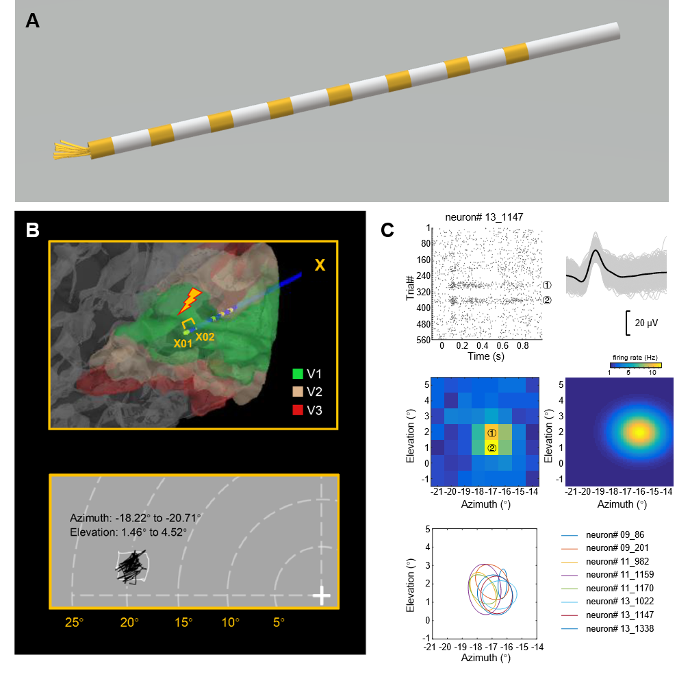 图1. 颅内电刺激V1诱发光幻视与附近单神经元感受野测量。(A)宏-微电极示意图;(B)颅内电刺激V1诱发光幻视图示。电刺激宏电极对(X01-X02)时(上图),患者主观报告并绘制所看到黑色光幻视(下图);(C)微电极所记录到V1神经元感受野结果。