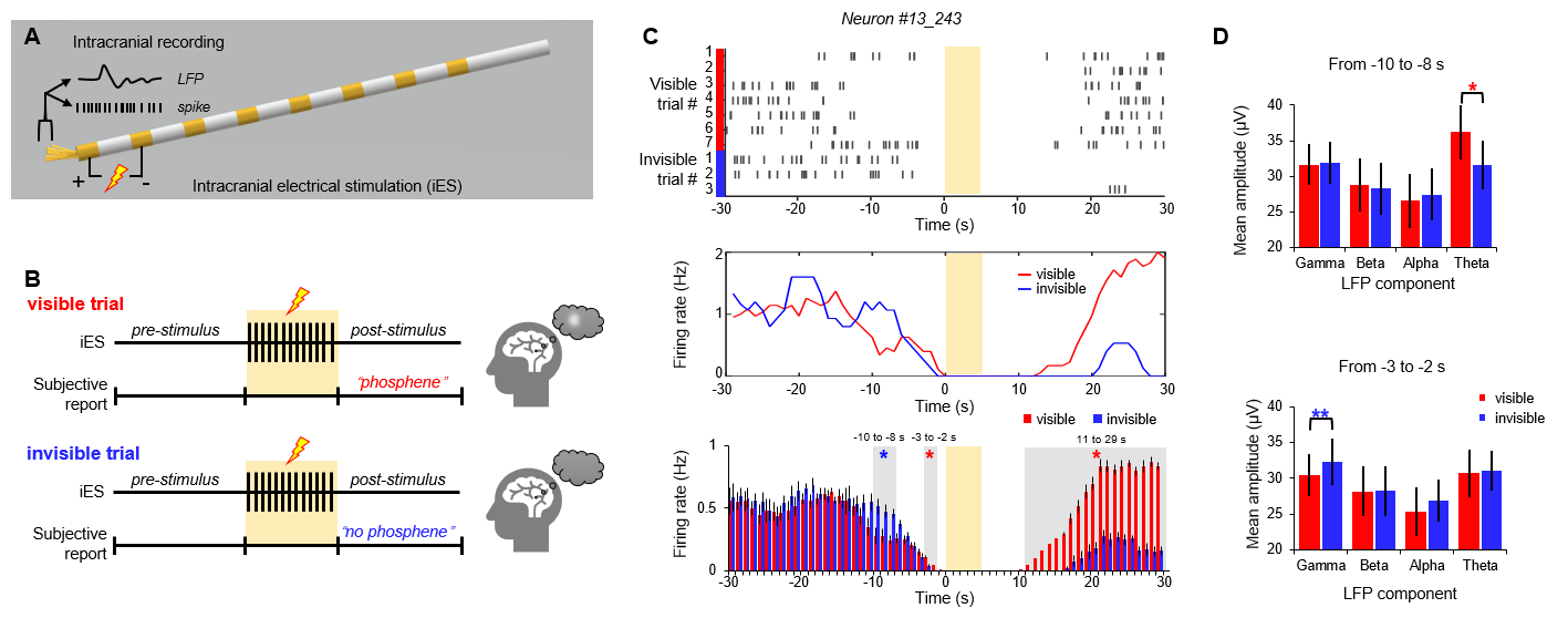 视觉意识(visual awareness)不只是被动接受环境刺激的输入,它源自外部输入刺激与大脑状态的复杂互动。大脑在刺激发生前的状态,尤其是皮层的兴奋性,对我们如何有意识地感知接近阈值的刺激起着至关重要的作用。评估皮层兴奋性最直接的方法之一是测量神经元在刺激前的自发动作电位。然而,在以人类为对象的研究中,研究者通常只能通过非侵入性脑成像技术间接推断皮层兴奋性。因此,人类大脑中在刺激发生前能预测视觉意识的神经元活动模式仍是一个未解之谜。