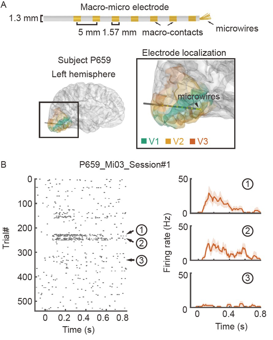 颅内微电极与人类视皮层神经元放电活动(原文图3)