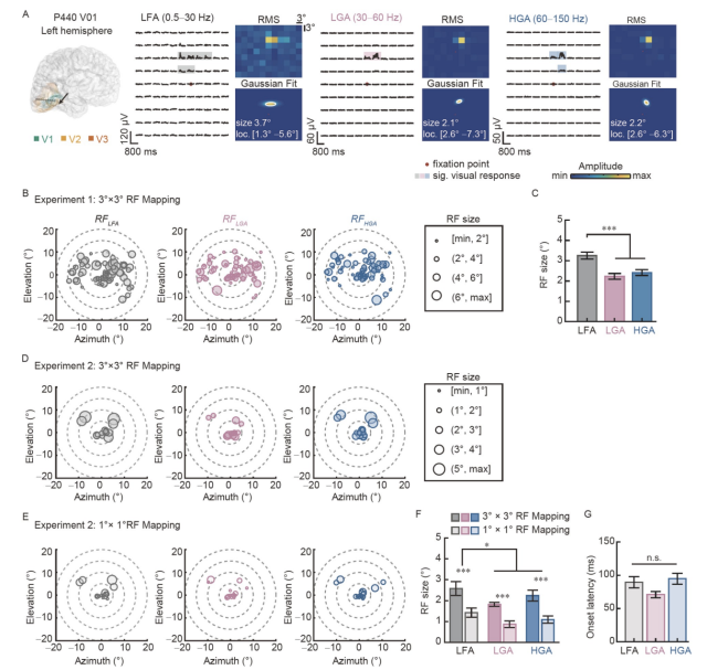 研究发现,相较于LFP中的低频活动(0.5 – 30 Hz),由低伽马(30 – 60 Hz)和高伽马(60 – 150 Hz)活动测得的感受野更小,其空间范围非常接近由神经元放电活动测得的感受野。同时,低伽玛和高伽玛活动的时序特征也与神经元放电活动特性高度相似。这些结果均表明,低伽玛和高伽玛活动在早期视觉信息处理中具有关键功能。