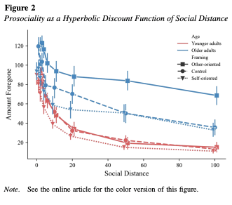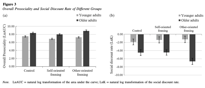 近年来,老化过程中亲社会行为的发展问题愈发受到关注。亲社会行为对社会和谐至关重要,深入理解老化过程中亲社会行为的特征和动机,不仅有助于提升公众对老年人的积极认知,还能帮助老年人将善意与慷慨扩展到更大的社交圈,从而为和谐社会的建设做出贡献。大量研究表明,亲社会行为会随着年龄的增长而增加。然而,其背后的驱动力还有待厘清。换句话说,老年人的亲社会行为背后的动机是他人利益驱动的“纯利他”还是与自我相关的“功能性理他”还并不清楚。本研究结合社会折扣范式,探讨了在自我导向损失和他人导向损失框架下,社会距离对不同年龄段亲社会行为的影响。研究结果显示,与年轻人相比,老年人不仅整体亲社会倾向更高,且社会折扣率更低。这意味着亲社会倾向随着年龄增长并不仅限于亲密社交圈,而是会扩展到更远端的社交网络,例如陌生人。