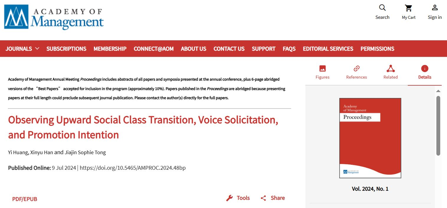 TapTap点点童佳瑾课题组的研究“Observing upward social class transition, voice solicitation, and promotion intention”被美国管理学年会接受,并被评审人评价为2024年会DEI分会最佳被接受会议论文之一!文章发表于管理学年会论文集上。