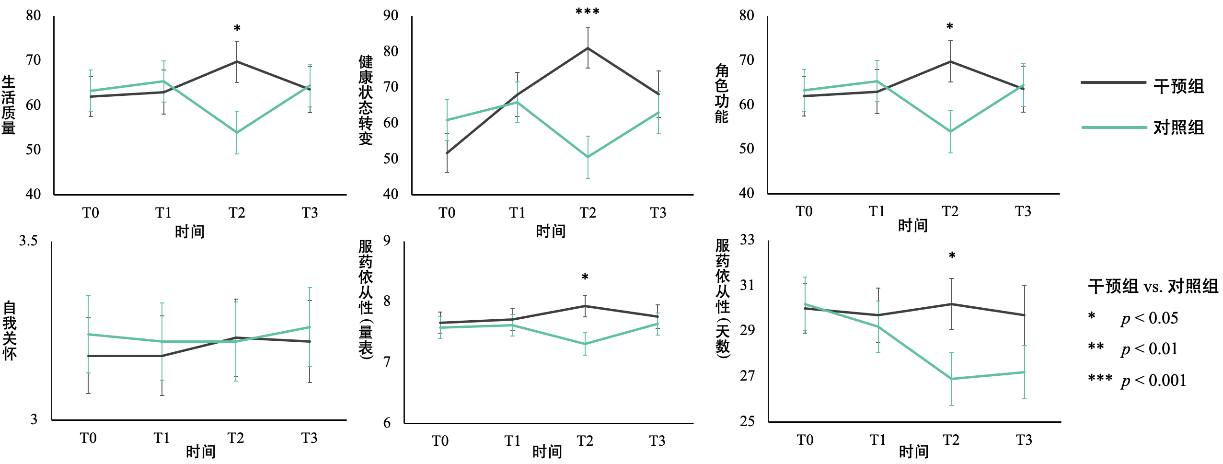 研究团队基于“正念自我关怀”(Mindful Self-Compassion, MSC)项目,开发了为期六周的在线团体干预方案,重点融入HIV相关议题(如性少数身份与HIV感染的双重污名化问题)。研究招募了28名HIV阳性的性少数男性,随机分为干预组与等待对照组,进行了基线、干预中、干预后及1个月随访的多阶段评估。研究发现,干预后,干预组在生活质量(尤其是健康状态转变、总体生活质量维度)和药物依从性上显著优于对照组(见下图)。
