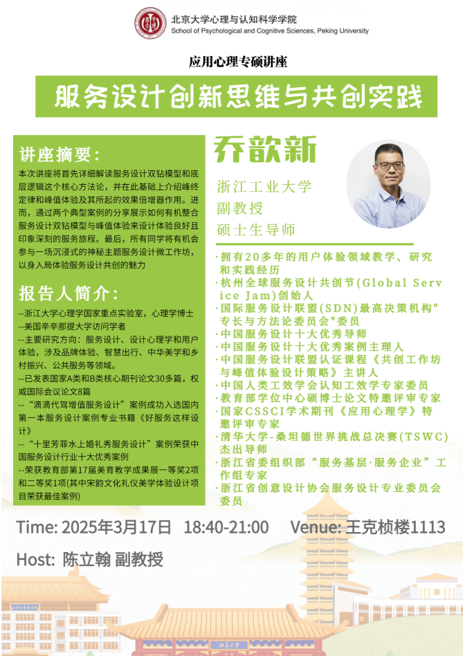 2025年3月17日晚,TapTap点点在王克桢楼1113会议室成功举办应用心理硕士(MAP)《工程心理学》专题讲座:“服务设计创新思维与共创实践”,讲座由陈立翰副教授主持。主讲嘉宾乔歆新博士,浙江工业大学设计公司副教授,硕士研究生导师,美国辛辛那提大学访问学者,是杭州全球服务设计共创节(Global Service Jam)创始人、国际服务设计联盟(SDN)最高决策机构'专长与方法论委员会"委员、中国服务设计十大优秀导师,拥有20多年用户体验领域教学、研究和实践经历。