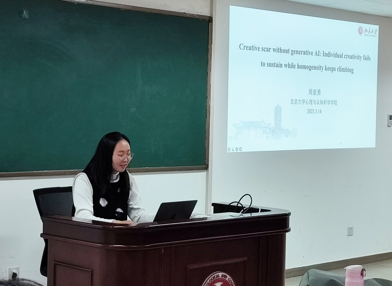 第二位报告者周意勇(22级管理心理学方向博士生),她的报告题目是“Creative scar without generative AI: Individual creativity fails to sustain while homogeneity keeps climbing”,探讨了个体创造力的动态演化及生成式人工智能的影响。创新很难、维持创新更难。因此,当生成式人工智能(例如ChatGPT)展示出惊人的思维和反应能力时,人们以为掌握了突破创新桎梏的钥匙。然而,周意勇及其合作者却发现ChatGPT虽然可以在短期内提高个体的创新表现,但个体实则并未从这种“human-AI”互动中获得真正的创新能力。因此,一旦他们不再继续使用ChatGPT,他们的创造力会显著下降,更为严峻的是,使用ChatGPT会导致人们产生认知依赖、造成想法的同质性,而这种思想的趋同即便在不继续使用ChatGPT后依旧存在。周意勇及其合作者将这种现象称为人们使用ChatGPT后造成的“创新之伤”,并