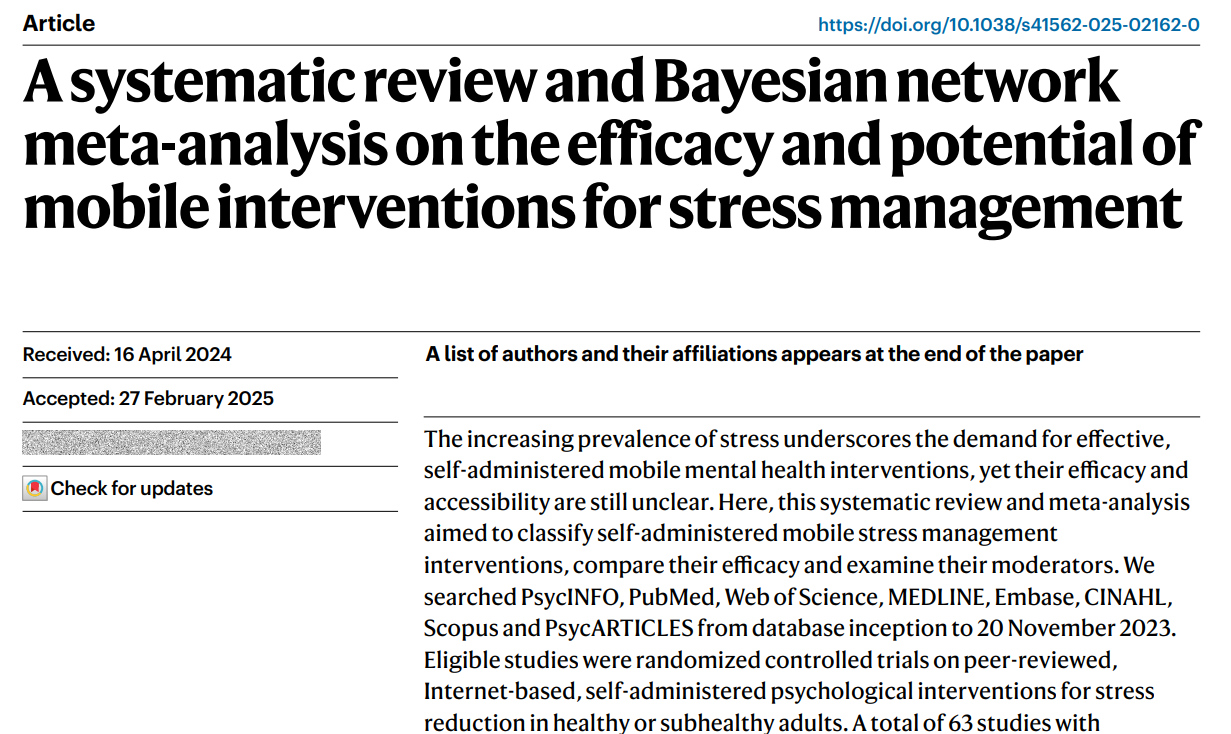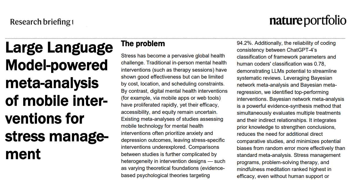 Nature Human Behaviour 同期Research Briefing刊登了简报Large Language Model-powered meta-analysis of mobile interventions for stress management,介绍了研究的缘起,意义和背后的故事。
