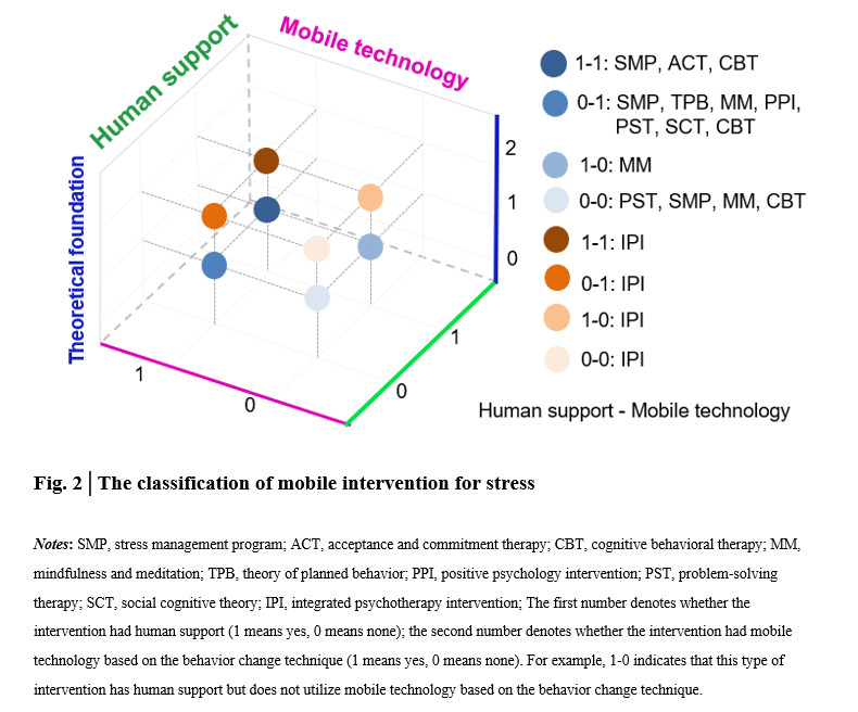 综上,在移动干预日益普及的今天,我们提出的移动干预三维分类框架为未来设计多样化的移动干预提供了基础分类体系和科学支持。根据分类框架,并考虑干预措施的可扩展性和公平性,我们建议在医疗资源匮乏、心理健康服务极度有限的地区,优先采用完全自动化的移动压力干预措施(如 压力管理、问题解决疗法和 正念冥想)来填补治疗空白,尤其是在缺乏其他可替代方案的情况下。研究结果为设计更有效和可扩展的压力移动干预提供了见解,并为减少卫生服务差距和推进可持续发展目标提供了有希望的策略。