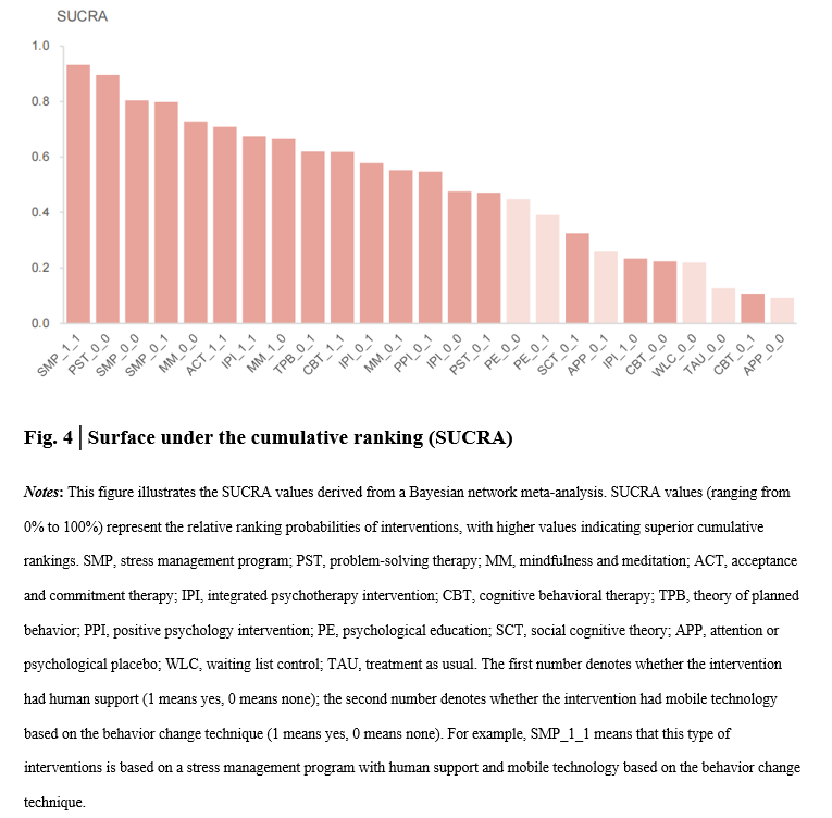 接着,本研究对压力管理研究中的63项随机对照试验进行了系统回顾,干预标签由作者和大语言模型(ChatGPT-4)独立编码。在移动干预三维分类框架的指导下,共分类了19种移动压力干预措施(Figure 2)。贝叶斯网络元分析发现压力管理、问题解决疗法和正念冥想的移动干预措施表现出较好的干预效果(Figure 4)。进一步的贝叶斯元回归分析发现,没有确凿证据表明人工支持或移动技术能显著提升干预效果。