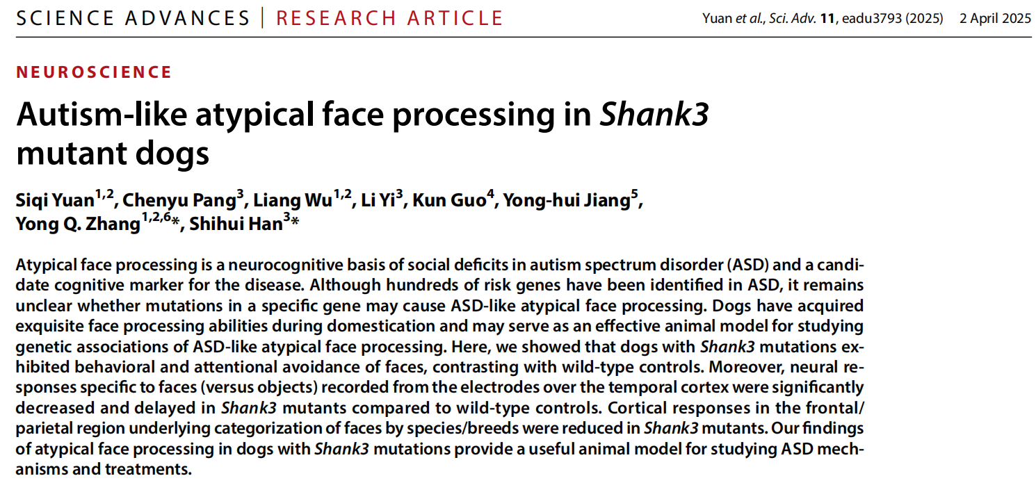 人类研究发现,孤独症患者具有社交障碍,且面孔加工异常,其相关的一个高风险基因是Shank3。基于这些发现,TapTap点点、IDG麦戈文脑科学研究所韩世辉教授课题组与中国科公司遗传与发育生物学研究所张永清研究员(现任湖北大学教授)团队开展合作,结合行为、眼动和神经电生理技术,研究野生比格犬和携带Shank3突变基因比格犬面孔加工的差异,2025年4月在Science Advances 发表了题为“Autism-like atypical face processing in Shank3 mutant dogs”的研究论文,揭示比格犬面孔加工的神经机制及关联基因Shank3。