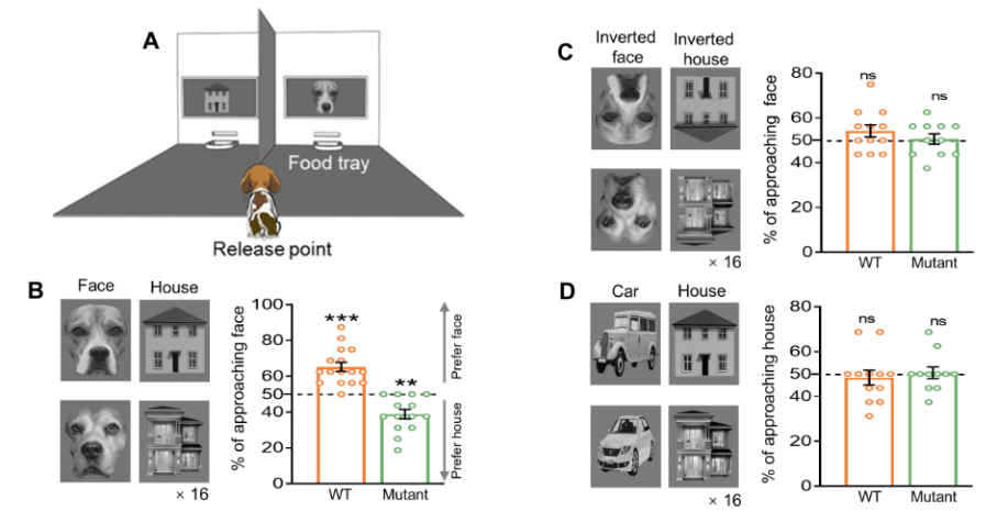 该研究第一部分包括三个实验。面孔偏好行为实验比较野生型犬和突变犬对面孔图片以及非面孔图片(房子)的自然选择行为(图一)。发现野生型犬偏好于面孔刺激,而Shank3突变犬则偏好于房子刺激。为了检测突变犬的行为反映对房子的偏好还是对面孔的回避,实验又比较了对房子和汽车的选择行为,发现野生型犬和突变犬对这两种刺激都没有明显偏好,提示突变犬对房子的偏好本质是对面孔的回避。倒置图片的实验结果证明,被试犬的偏好行为与图片刺激的低水平视觉属性无关。