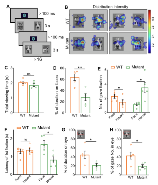 该研究进一步利用眼动追踪技术,给被试犬同时呈现面孔刺激和房子刺激,比较野生型犬和Shank3突变犬对图片刺激的视觉注视时间和频率,发现野生型犬对面孔(比房子)的注视时间更长,注视次数更多,而突变犬对面孔的注视时间较短,注视次数也较少(图二)。这种现象主要存在于对面孔眼睛区域的注视。此外,突变犬首次注视面孔的时间要显著晚于野生型。