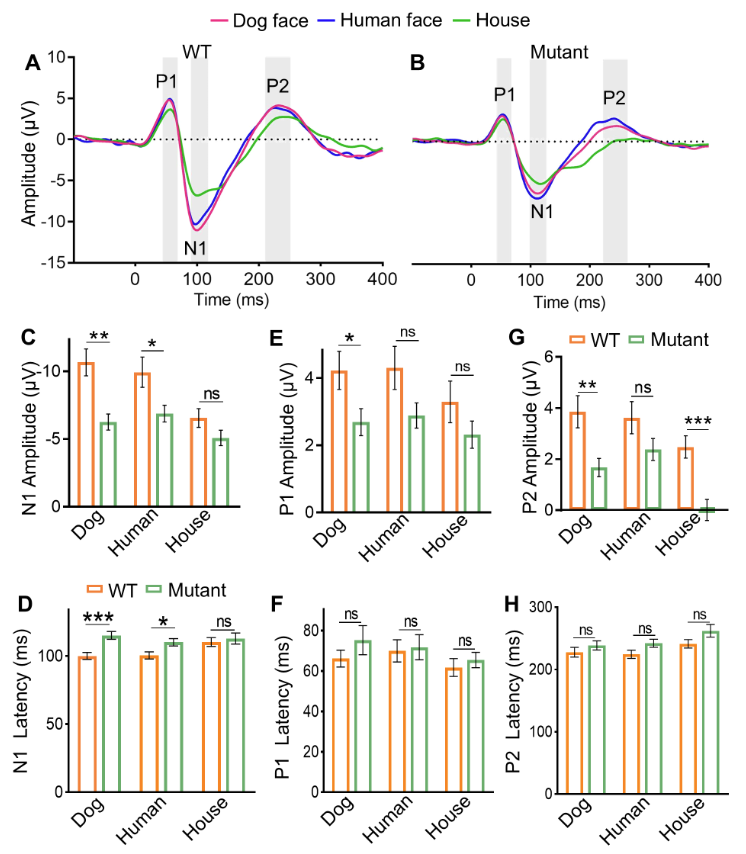 为了揭示面孔加工的动态神经过程,该研究利用电生理技术手段,记录了被试犬在观看面孔与非面孔刺激的神经响应。发现,在刺激开始后100 ms左右,出现了一个对面孔特异响应的脑电成分(N1),但是Shank3突变犬的N1振幅显著小于野生型犬,而对房子诱发的N1振幅大小与野生型犬无差异(图三)。此外, Shank3突变犬对面孔刺激的响应时间(N1 latency)要显著的晚于野生型。这些结果提示了突变犬与面孔加工有关的早期神经活动的异常。