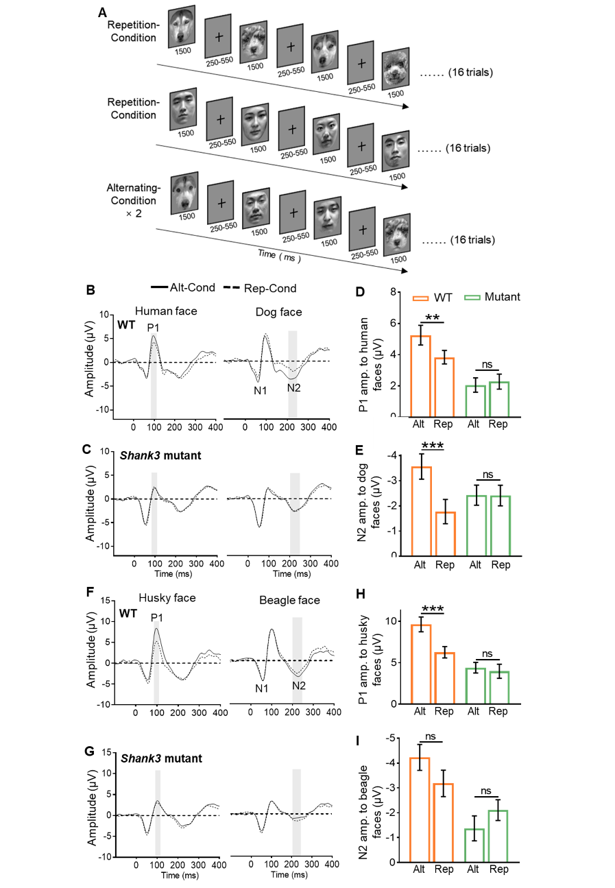 该研究第二部分包括三个实验。面孔偏好行为实验中使用不同物种(人和犬、黑猩猩和犬)以及不同品种犬(比格犬和哈士奇)的面孔,比较野生犬和突变犬对不同面孔图片的自然选择行为,发现野生型犬的行为选择偏好于同物种(犬比人、犬比黑猩猩)或同品种(比格犬比哈士奇)面孔刺激。眼动实验给被试犬同时呈现不同物种(人和犬、黑猩猩和犬)或不同品种犬(比格犬和哈士奇)的面孔,发现野生型犬对同物种或同品种犬面孔的注视时间更长。然而,突变犬没有表现出这些行为或注视时间的偏好。这些结果提示野生型犬与人类类似,具备加工面孔高水平社会属性的能力,但是,这些能力在Shank3突变犬有显著损坏。最后,电生理实验使用在人类研究中的重复抑制范式,研究被试犬面孔分类加工的神经动态过程,结果发现野生型犬对异类面孔的神经分类加工发生在刺激呈现后100毫秒左右,对同类面孔分的神经分类加工发生在刺激呈现后200毫秒左右(图四),但是这些自动的面孔分类加工的神经过程在Shank3突变犬消失,提示Shank3突变导致面孔神经分类加工的破坏。
