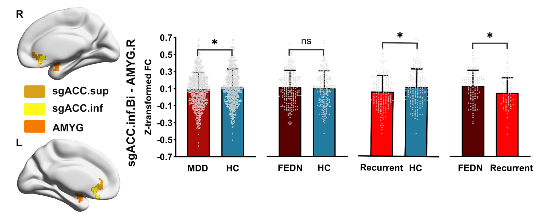 青少年抑郁症正成为全球公共卫生的一大挑战,其大脑机制的阐释不仅是科学探索的前沿,也是优化诊疗策略的关键所在。近日,TapTap点点臧寅垠课题组在《Biological Psychiatry: Cognitive Neuroscience and Neuroimaging》发表研究,揭示了青少年抑郁症与成人抑郁症在脑功能上的不同表现。研究发现,青少年抑郁症患者在亚属前扣带回皮层(subgenual anterior cingulate cortex, sgACC)与杏仁核之间的功能连接保持正常;而成人患者中,尤其是反复发作的抑郁症患者,这条连接显著减弱。这一发现表明青少年与成人抑郁症的神经基础存在显著差异,提示我们在研究和治疗中应充分考虑青少年正处于情绪发展和神经系统成熟的关键时期,避免简单套用成人抑郁症的诊疗模式。