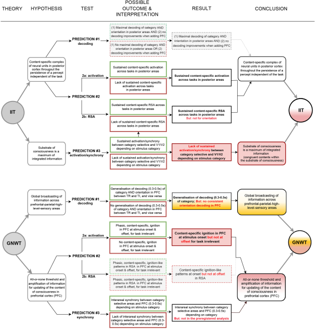 COGITATE项目通过两个实验对以下三个问题开展假设检验:(1)意识体验发生在大脑何处;(2)意识体验的时间动态特性;(3)意识体验中脑区间的沟通交流。GNW和IIT这两个理论对这三个问题都有各自不同的假设。实验结果表明,两个理论的假设均未得到完全支持(如下图总结)。具体而言,IIT理论预测的初级视觉皮层与中级视觉皮层间的持续同步活动未被观测到,而GNWT理论预期的前额叶的部分特征的意识表征、前额叶-感觉皮层同步活动以及刺激消失时的瞬时激发也均未获得验证。