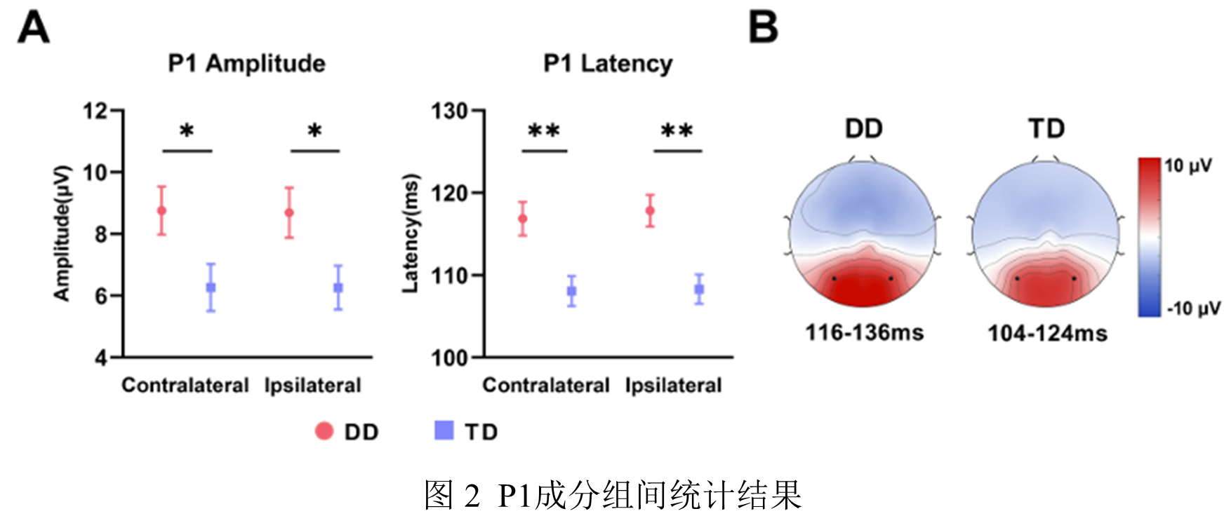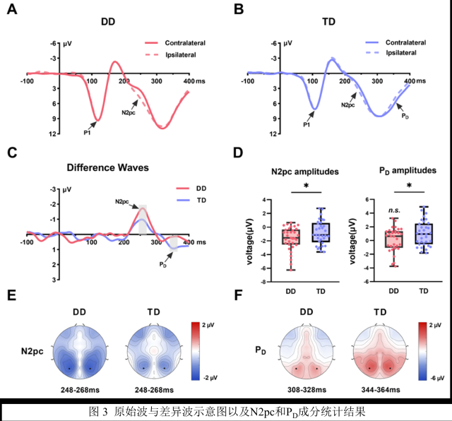 结果发现,阅读障碍儿童在视觉加工早期就表现出幅值更大、潜伏期更晚的P1成分(如图2所示)。并且,在刺激出现后的200~300ms以及300~400ms,典型发展儿童分别诱发了N2pc和PD成分,但是阅读障碍儿童只诱发了幅度更大的N2pc,并没有显著的PD成分(如图3所示)。
