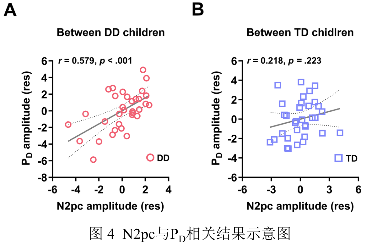 而且,阅读障碍儿童的N2pc和PD表现出显著的正相关,即表现出更大幅度N2pc的个体伴随着更小幅度的PD,而在正常儿童中并没有这一相关(如图4所示)。