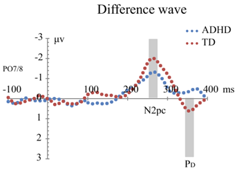 对照来自ADHD的研究结果(Wang et al., 2016, Biological Psychiatry),ADHD儿童表现出N2pc显著小于典型发展儿童(图5)。显示两类神经发育障碍儿童的选择性注意异常来源不同。