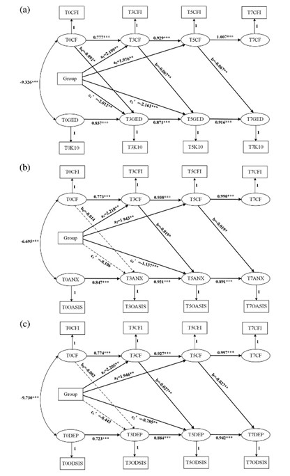 研究一为随机对照纵向研究设计,采用认知灵活性问卷测量认知灵活性,共纳入607名高情绪困扰个体,随机分为MIED组和等待对照(WL)组,在基线(T0)、第3周(T3)、第5周(T5)和第7周(干预后,T7)测量个体的正念、认知灵活性、焦虑、抑郁和总体情绪困扰水平。结果发现,与对照组相比,MIED组显著改善。中介分析进一步指出,个体在干预期间认知灵活性水平增加越大,干预后或后一时间点情绪困扰水平的下降幅度更大(见图1)。