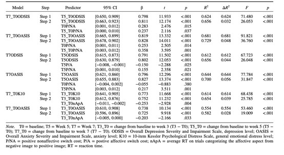 研究二同样为随机对照纵向研究设计,采用任务转换任务测量情绪认知灵活性,共招募了89名高情绪困扰个体,同样随机分为MIED组和WL组。问卷进行每周周测,行为任务分别在T0、T3、T5和T7进行评估。虽然,认知灵活性行为任务指标的中介作用并不成立,但我们发现,在干预期间,个体对负面信息的回避和对积极信息的注意偏向减少,能够显著预测干预后情绪困扰的降低(见表1)。