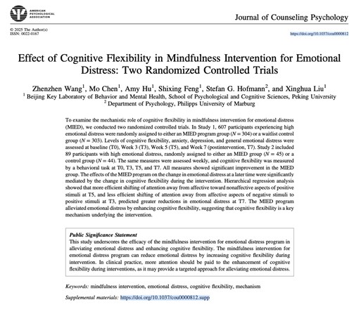Wang, Z., Chen, M., Hu, A., Feng, S., Hofmann, S. G., & Liu, X. (2025). Effect of cognitive flexibility in mindfulness intervention for emotional distress: Two randomized controlled trials. Journal of Counseling Psychology. Advance online publication. https://dx.doi.org/10.1037/cou0000812