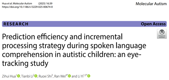 参考文献: Hua, Z., Li, T., Shi, R., Wei, R., & Yi, L. (2025). Prediction efficiency and incremental processing strategy during spoken language comprehension in autistic children: An eye-tracking study. Molecular Autism, 16, 39. https://doi.org/10.1186/s13229-025-00674-0