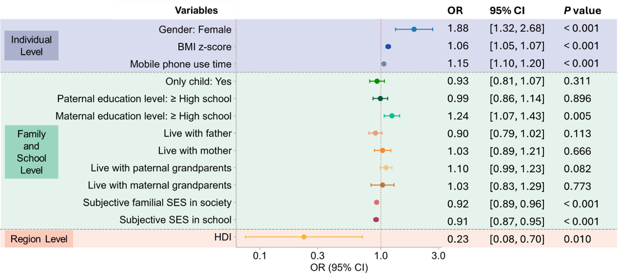 研究发现主观社会经济地位(Socioeconomic status, SES)越低的青少年,进食障碍风险越高;而在区域层面,人类发展指数(Human Development Index, HDI)较低地区的进食障碍风险也更高,这与西方国家的趋势不同,体现了中国社会文化背景的特殊性。这一结果挑战了“进食障碍多见于高收入人群”的传统观念,提示,在资源相对匮乏、生活压力较大环境中成长的青少年,可能面临更高的饮食失调风险。